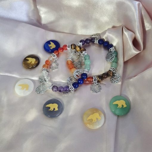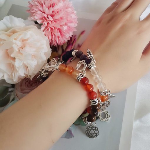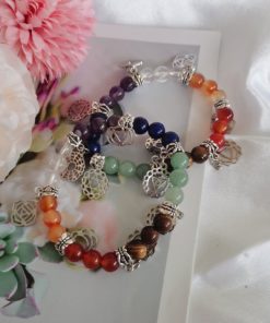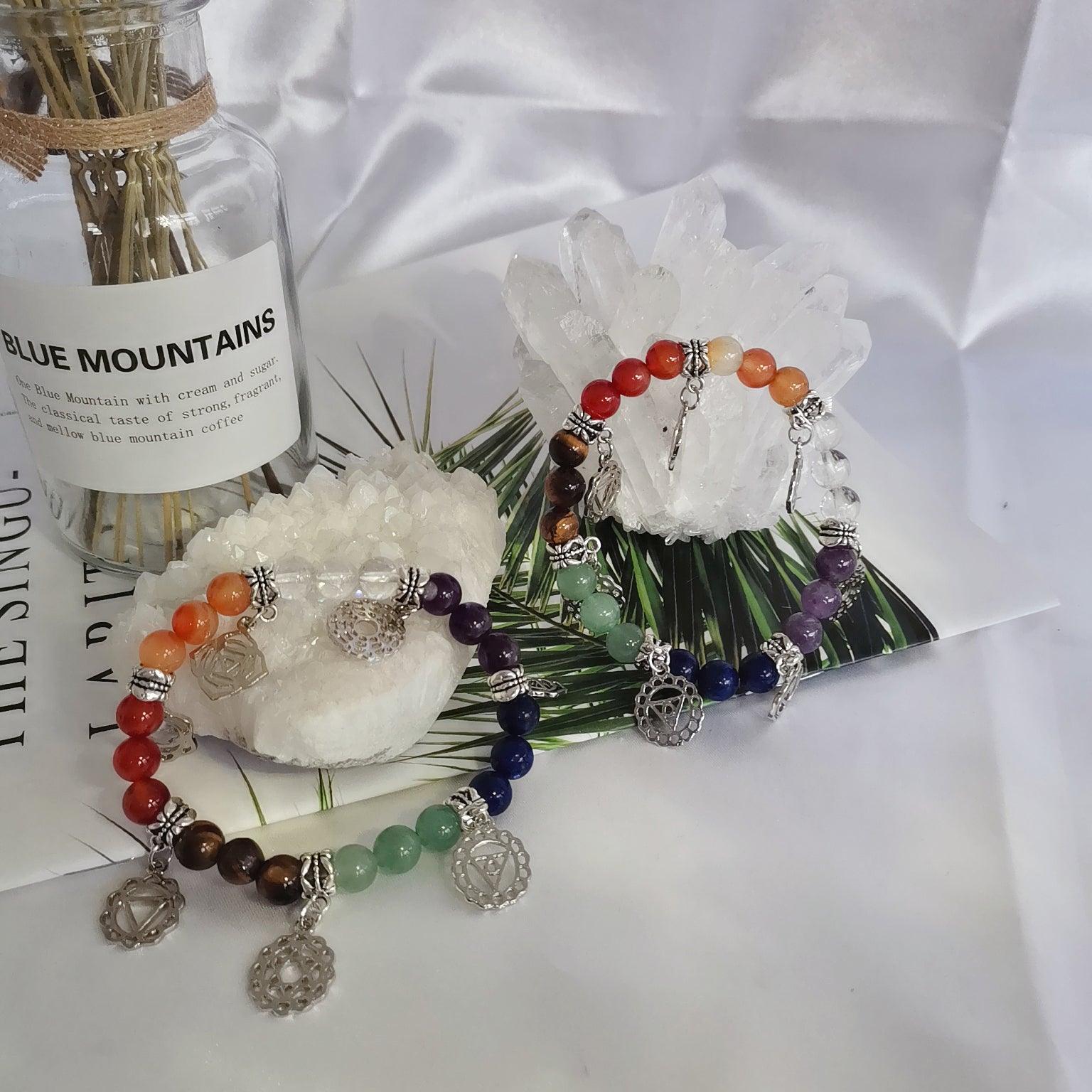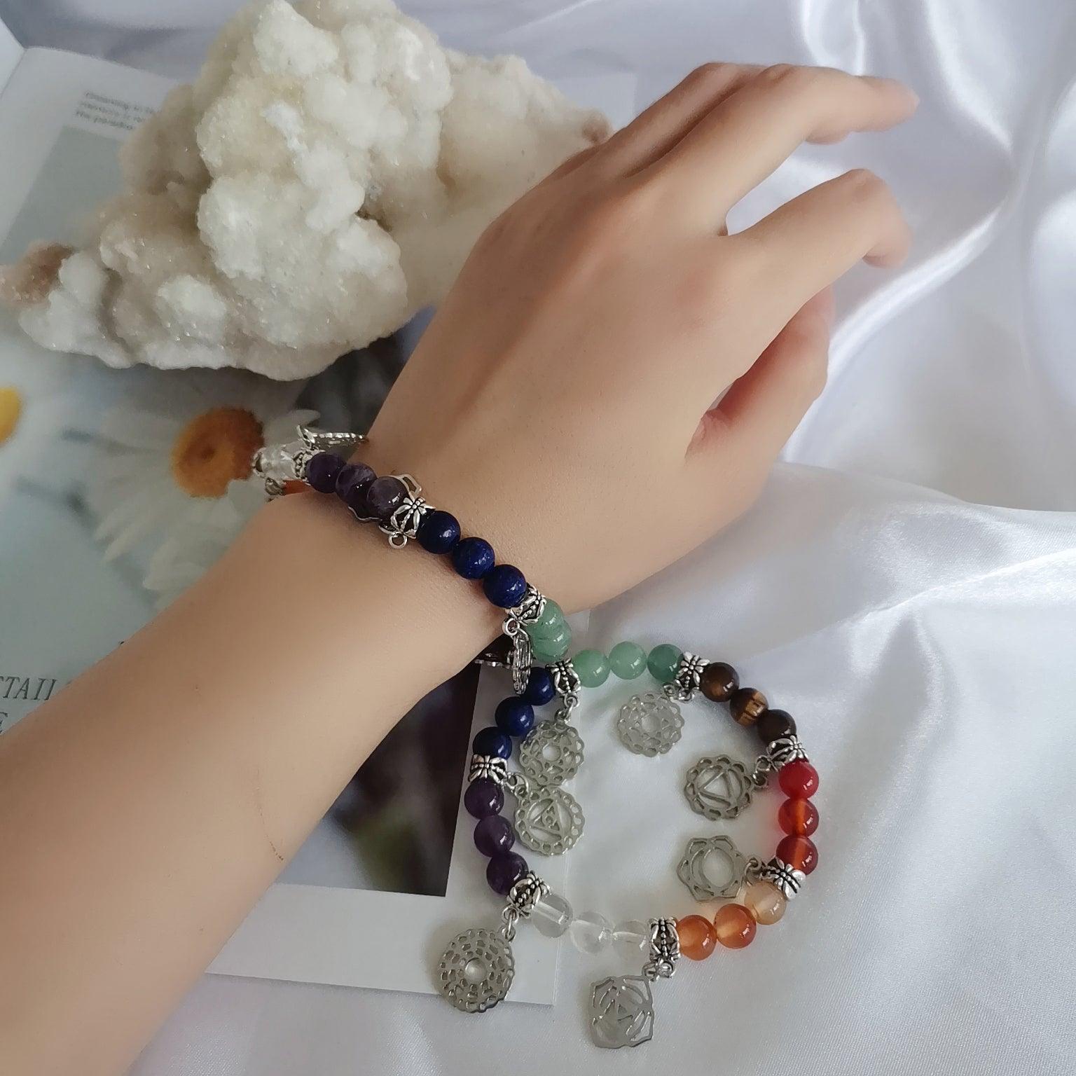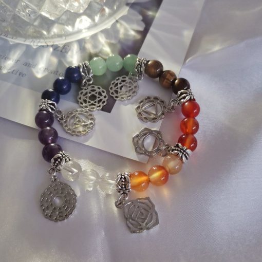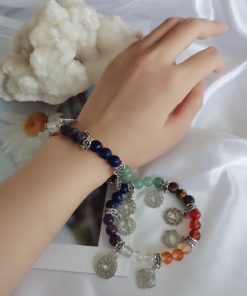 7 Chakra Bracelet Material: Amethyst, Clear Quartz, Green Aventurine, Lapis Lazuli, Red Agate, Tiger Eye Stone, Yellow Agate. They will surely help you with energy flow. Aura balancing.