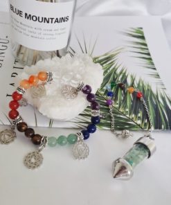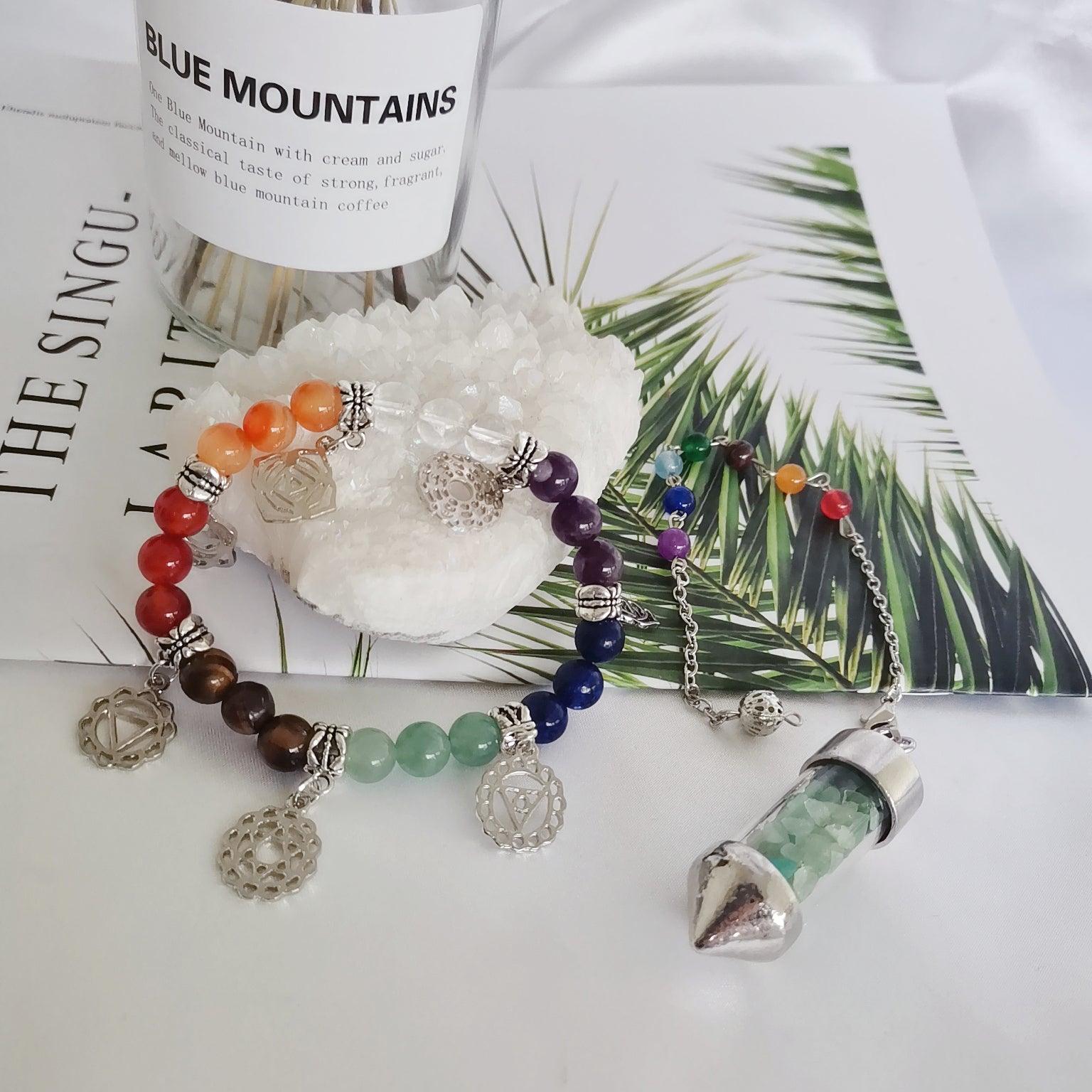 Amethyst(Crown Chakra),Clear Quartz(Third-eye Chakra),Lapis Lazuli(Throat Chakra),Green Aventurine(Heart Chakra),Yellow Agate(Solar Plexus),Tiger Eye Stone(Sacral Chakra),Red Agate(Root Chakra)