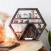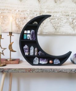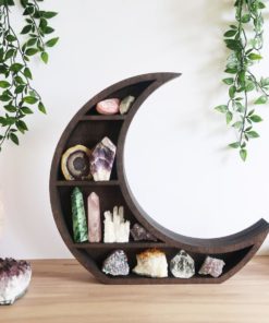 The moon shelf has three shelf compartments to store your crystals and the shelf is approximately 1-inch deep.