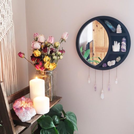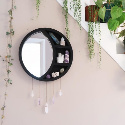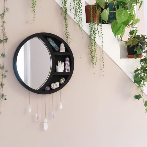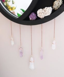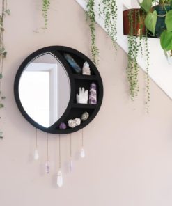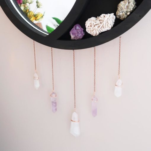 This Crescent Moon Mirror shelf will brighten up any room with its reflective mirror surface and beautiful design! The bottom of the moon has copper chain and five crystal points hanging from them which are clear quartz and amethyst.