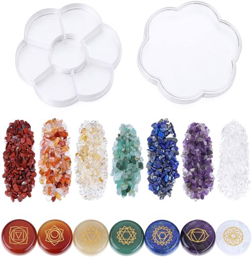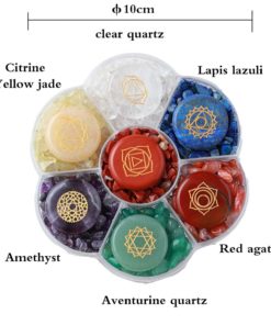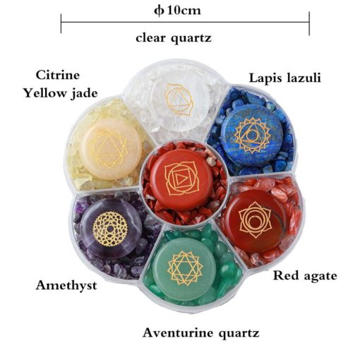 [7 Chakra Crystals Specifications]: tumbled chakra stones: 0.98-1.02 inches/pcs; plastic box: 4 inches in length and width. Material: natural 7 chakra crystals,Weight: 155g. Package: 1x chakra crystal stone set