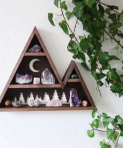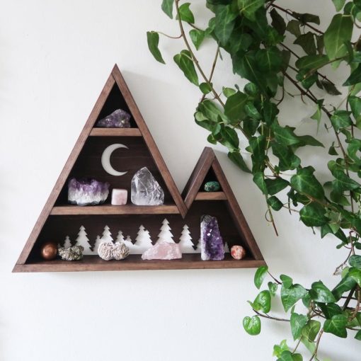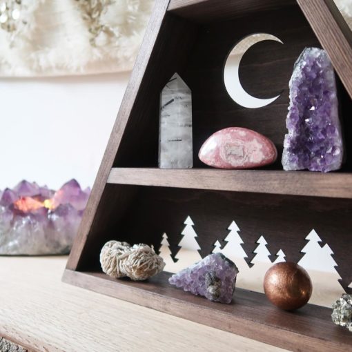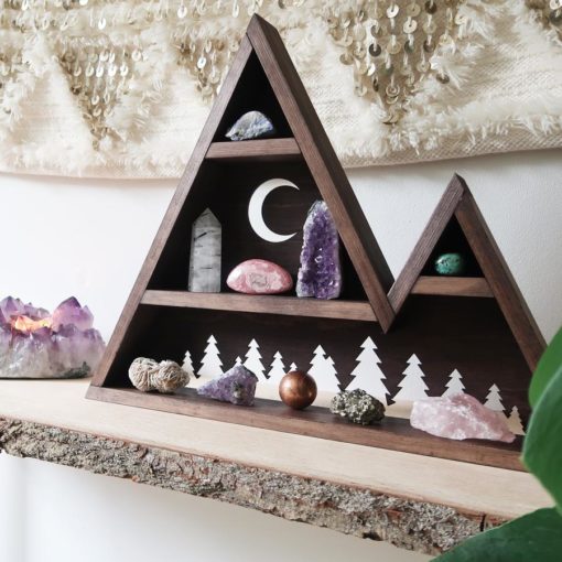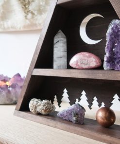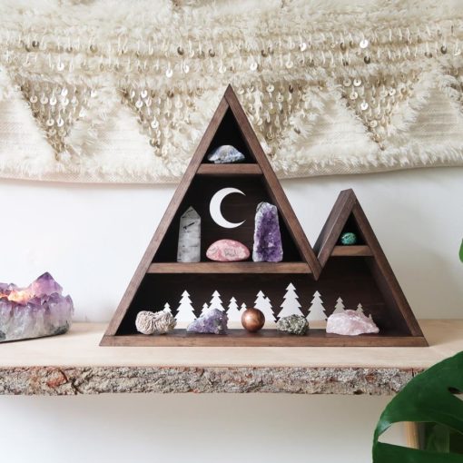 A beautifully handmade mountain which has been designed to store and display your crystals or keepsakes with a beautiful forest and moon design cut out of the back. Made from solid Pine and stained in a dark Oak colour.