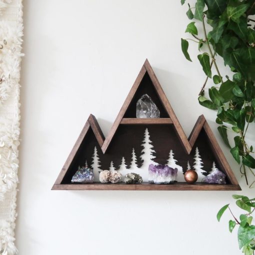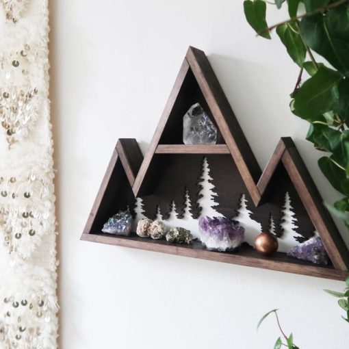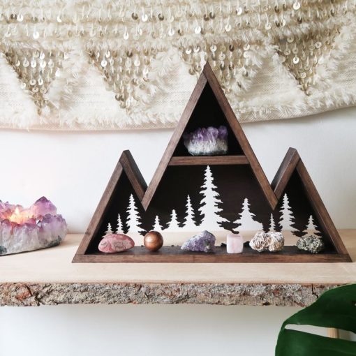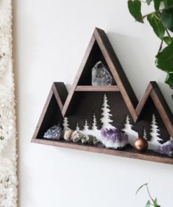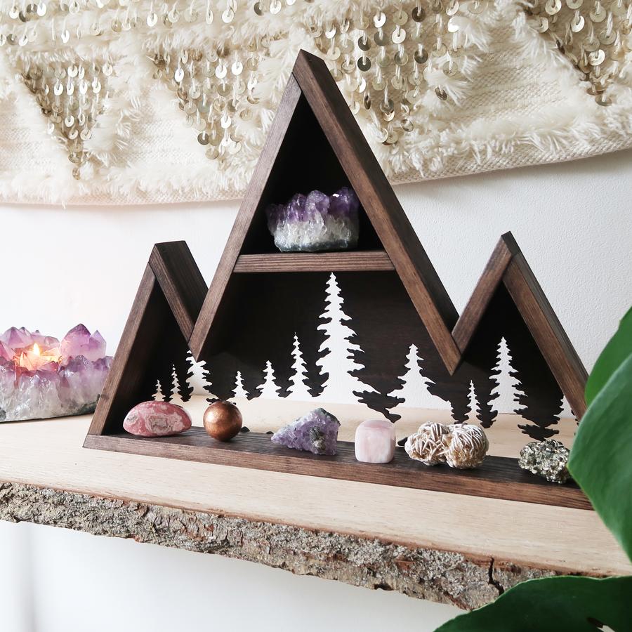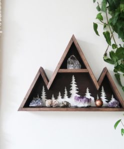 A beautifully handmade triple mountain which has been designed to store and display your crystals or keepsakes. Made from solid Pine and stained in a dark Oak colour.