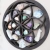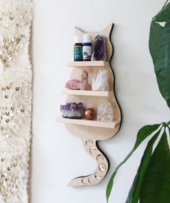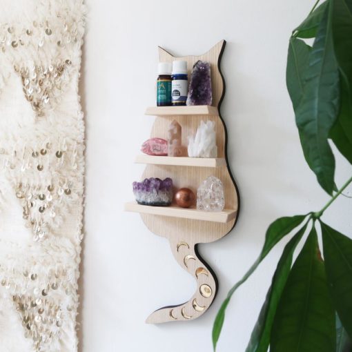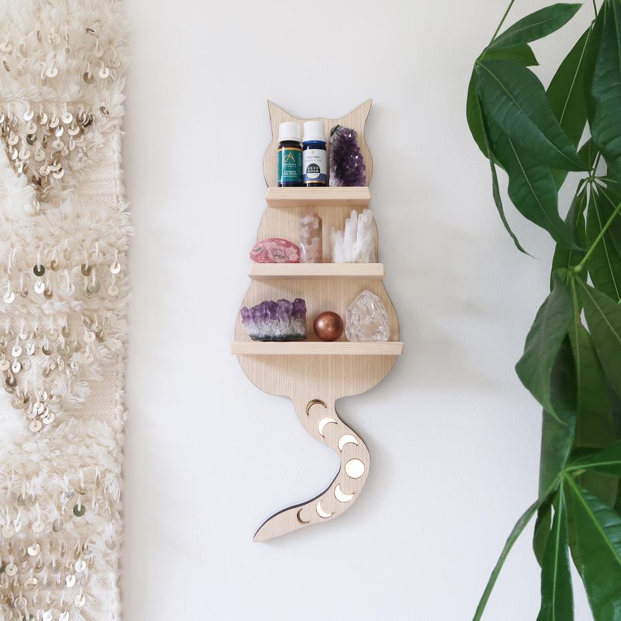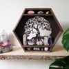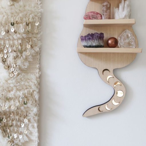 This beautiful wooden art piece comes complete with shelves to display crystals, essential oils, mystical treasures and mirrors weaving through its tail!