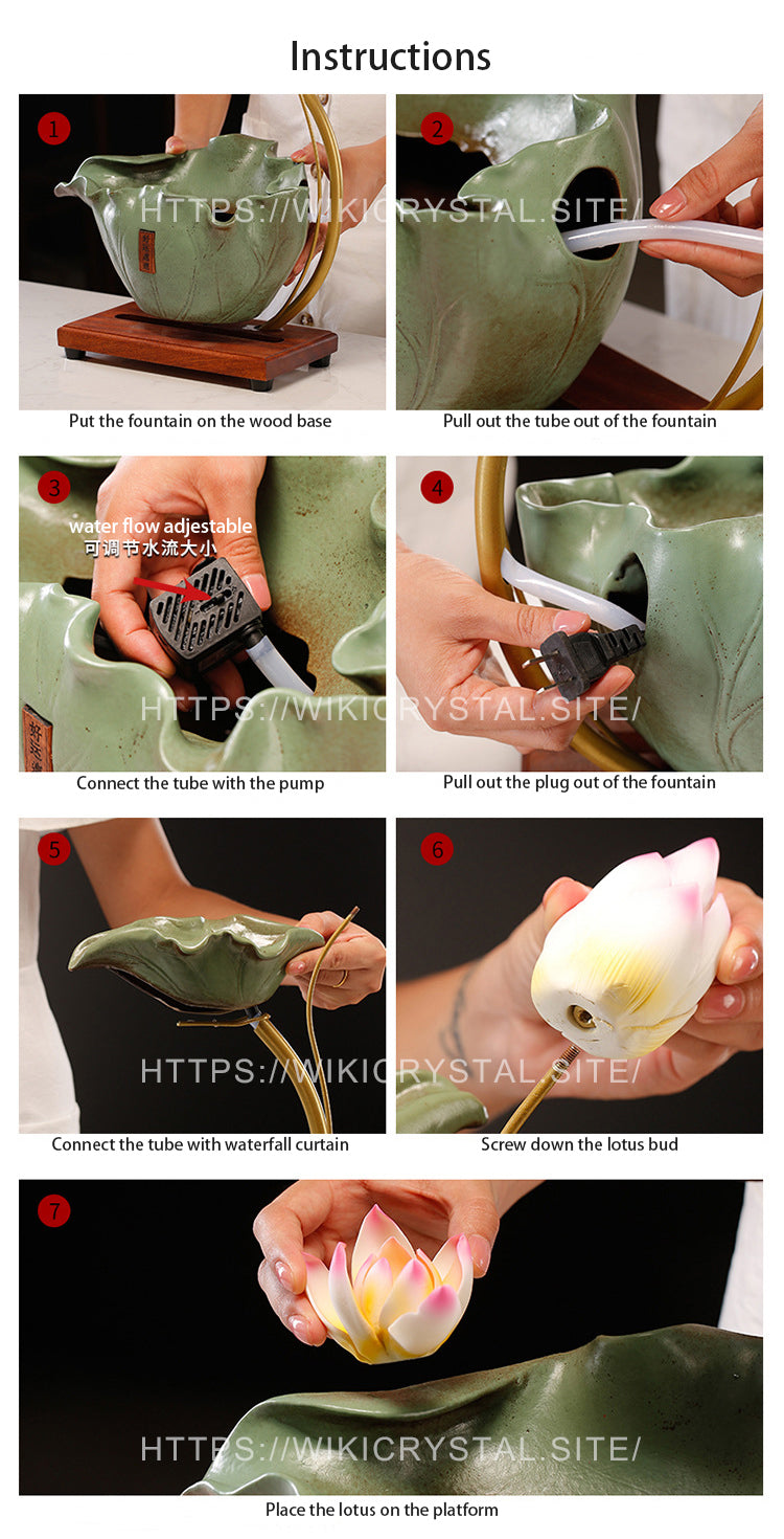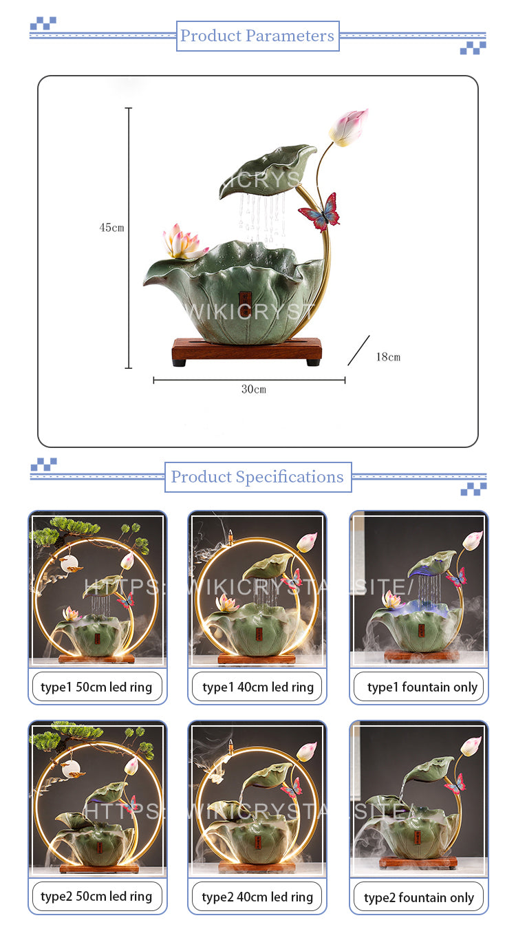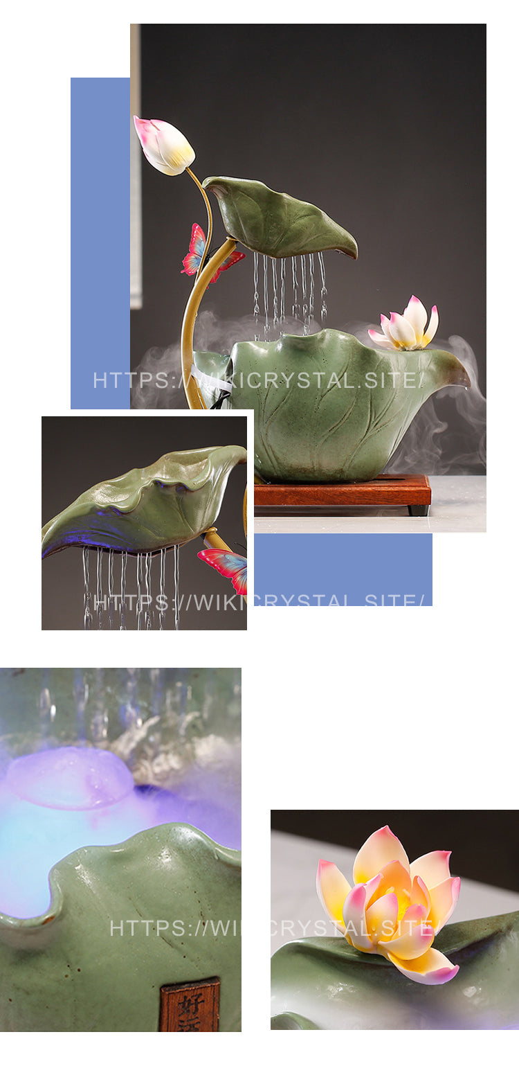 Creative Ornament Lotus Ceramic Water Fountain Office Desktop Indoor Decoration with Waterfall Curtain LED Light