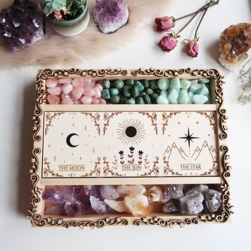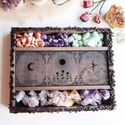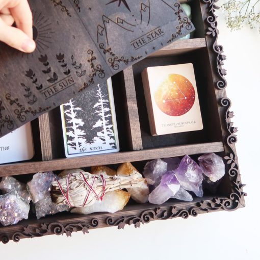 Made from solid pine and either left natural or stained in a dark oak colour. The display box has three main compartments that can hold three regular sized tarot decks (measuring approximately 12 cm x 7 cm) and two long compartments top and bottom perfect for displaying crystals or something long such as a smudge stick.