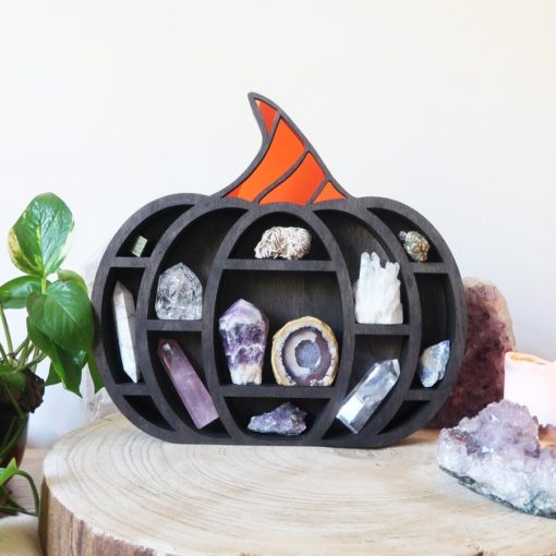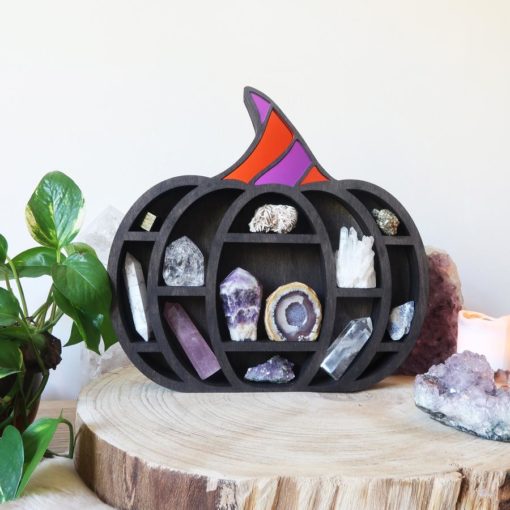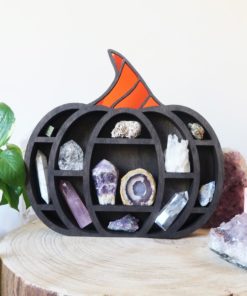 This beautiful wooden pumpkin shelf is a wonderful spooky design for any time of the year. It is made out of Poplar wood and stained in a dark oak colour, the top of the pumpkin has tinted mirror sections and you can choose between orange tinted mirror or purple and orange tinted mirror.
