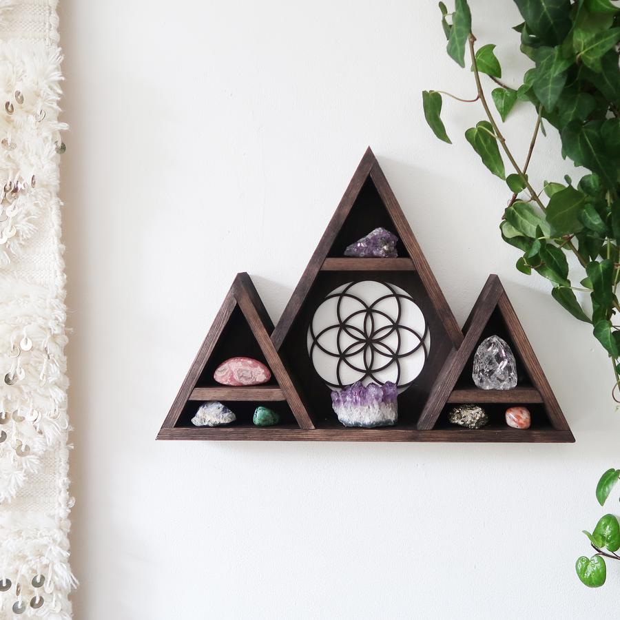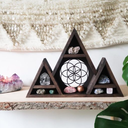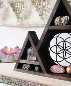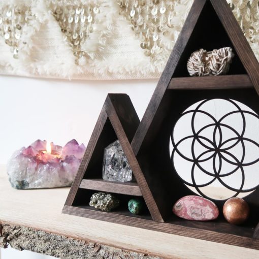 A Crystal shelf designed to hold your keepsakes and treasures. Comes complete with a cut out Seed Of Life design in the back of the shelf. It has been stained in a dark oak colour and is made from solid pine .