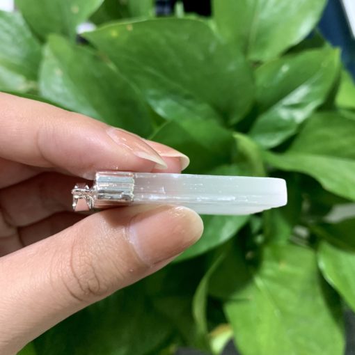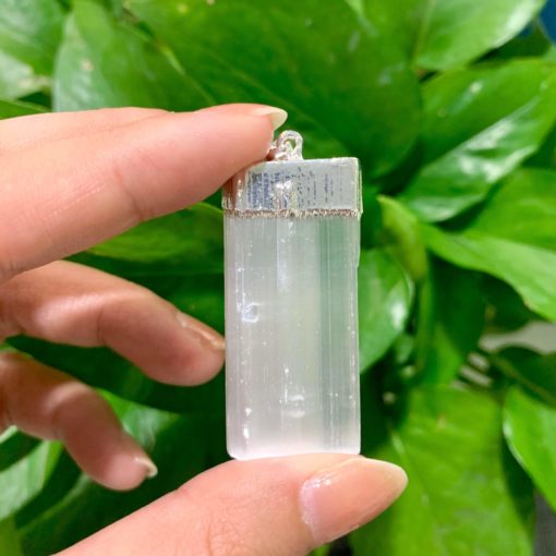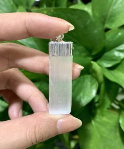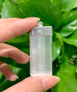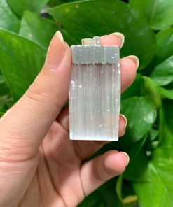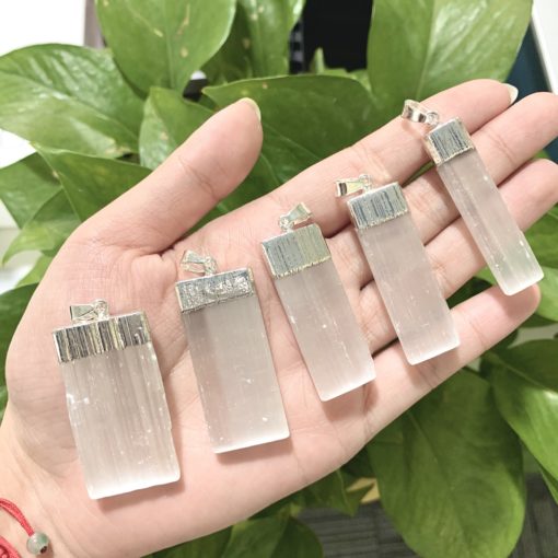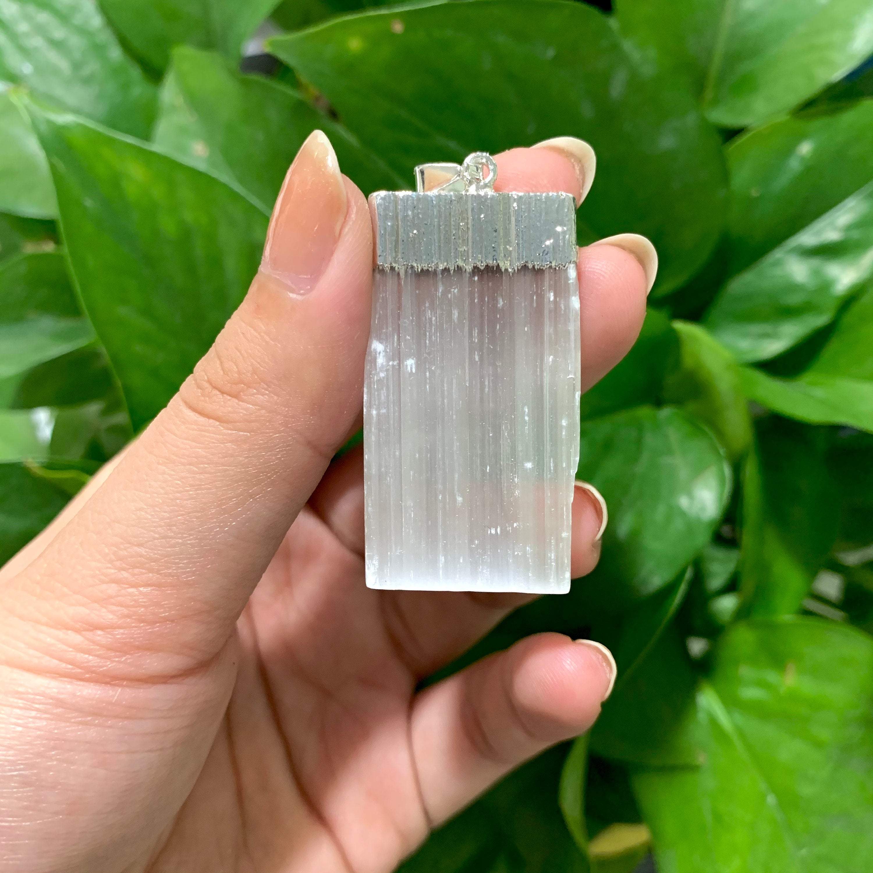 NATURAL SELENITE SILVER PENDANT A. 12g, 40mm x 22mm B. 11g, 41mm x 19mm C. 9g, 40mm x 15mm D. 9g, 42mm x 13mm E. 6g, 43mm x 9mm Selenite is a specific variety of the mineral gypsum named after the Ancient Greek goddess of the moon, Selene. The Greeks especially appreciated the beauty of selenite, even making windows with the stone. We collect beautiful crystals and craft supplies from all around the world. And our factory is in Donghai,China which is one of the crystal city in our country. And we are very selective about the crystals and stones that we selling in our shop and make sure they are best for our customer!!