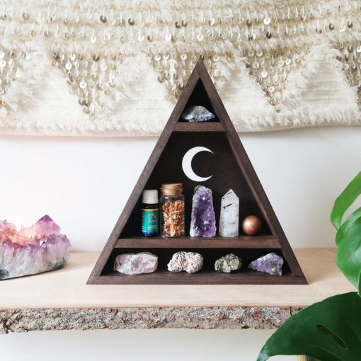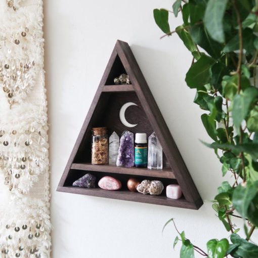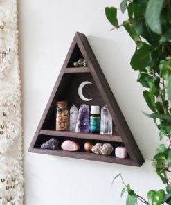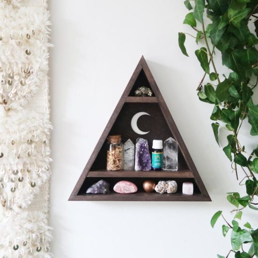 This unique wooden shelf is perfect for storing your crystals and keepsakes. Made from solid pine and stained in a dark oak colour with a beautiful crescent moon cut into the back!